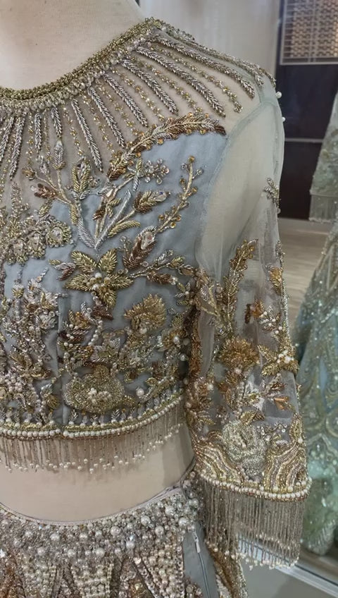 This exquisite lehenga choli is a testament to unparalleled artistry, lavishly adorned with the finest jewels sourced from across the globe — including lustrous pearls, radiant kundan, shimmering crystals, and dimensional 3D gemstones. Draped in a flawless fusion of icy blue and mint hues, the ensemble radiates freshness and regal charm. Designed to epitomize refined elegance, it is the perfect statement piece for a wedding celebration, capturing both grandeur and sophistication in a single silhouette.