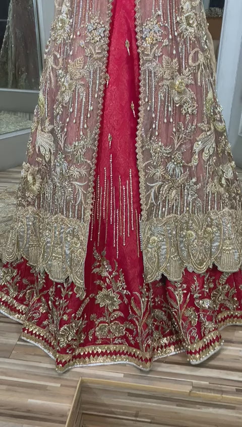 Every bride dreams of the timeless allure of red, and the Auree Bridal brings that dream to life. This opulent ensemble features a regal long golden shirt paired with a majestic red lehenga, lavishly encrusted with pure crystals and dazzling diamond gemstones. The striking contrast of gold and red radiates heritage grandeur, while the intricate embellishments add layers of brilliance and sophistication. A breathtaking celebration of tradition and luxury, Auree is designed for the bride who wishes to embody both majesty and elegance on her wedding day.