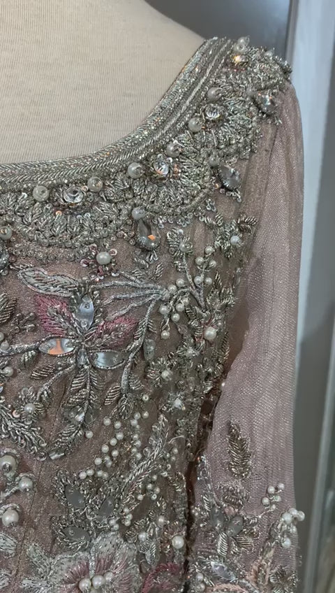 The Rosen Bridal is a luxurious tea pink ensemble that blends timeless tradition with modern sophistication. The lehenga and blouse are intricately handcrafted with dapka and resham embroidery, lavishly encrusted with shimmering Austrian Swarovski crystals for a radiant, jewel-like effect. Completing the look is a breathtaking dupatta, richly embellished with cascading pearls, adding drama and ethereal charm to the silhouette. Designed as part of our Bridal Campaign Collection, Rosen is a true vision of elegance, opulence, and couture splendor — crafted for brides who wish to embody romance and regality.