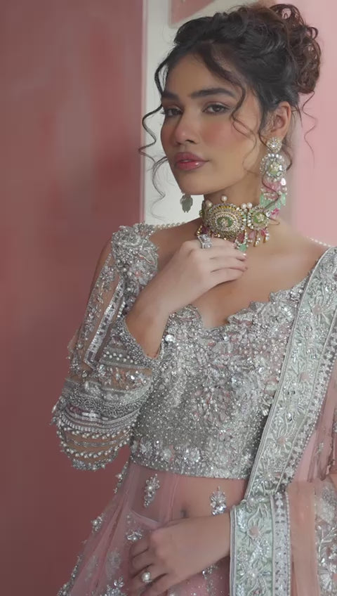 The Camille Bridal is a dreamy peach lehenga adorned with intricate pistachio and silver Swarovski embellishments, creating a palette of soft sophistication. Paired with a chic peplum bodice, the silhouette strikes a balance between modern couture and timeless elegance. A delicate net dupatta with crystal accents completes the ensemble, adding subtle sparkle and grace. Designed as a true trousseau masterpiece, Camille embodies romance, refinement, and the modern bride’s vision of understated luxury.