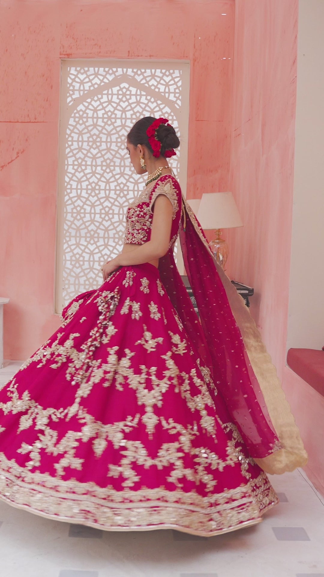 Cherie Bridal is an enchanting dark pink lehenga choli, richly detailed with intricate gold tilla and dabka artistry. The finely crafted choli pairs with a symmetrical lehenga that radiates balance and grandeur, creating a silhouette of refined beauty. A delicate net dupatta, finished with shimmering gold accents and an ornate border, completes the look with grace and opulence. Designed to embody royal elegance and romantic charm, Cherie is a timeless couture piece for brides who wish to shine with sophistication and presence.