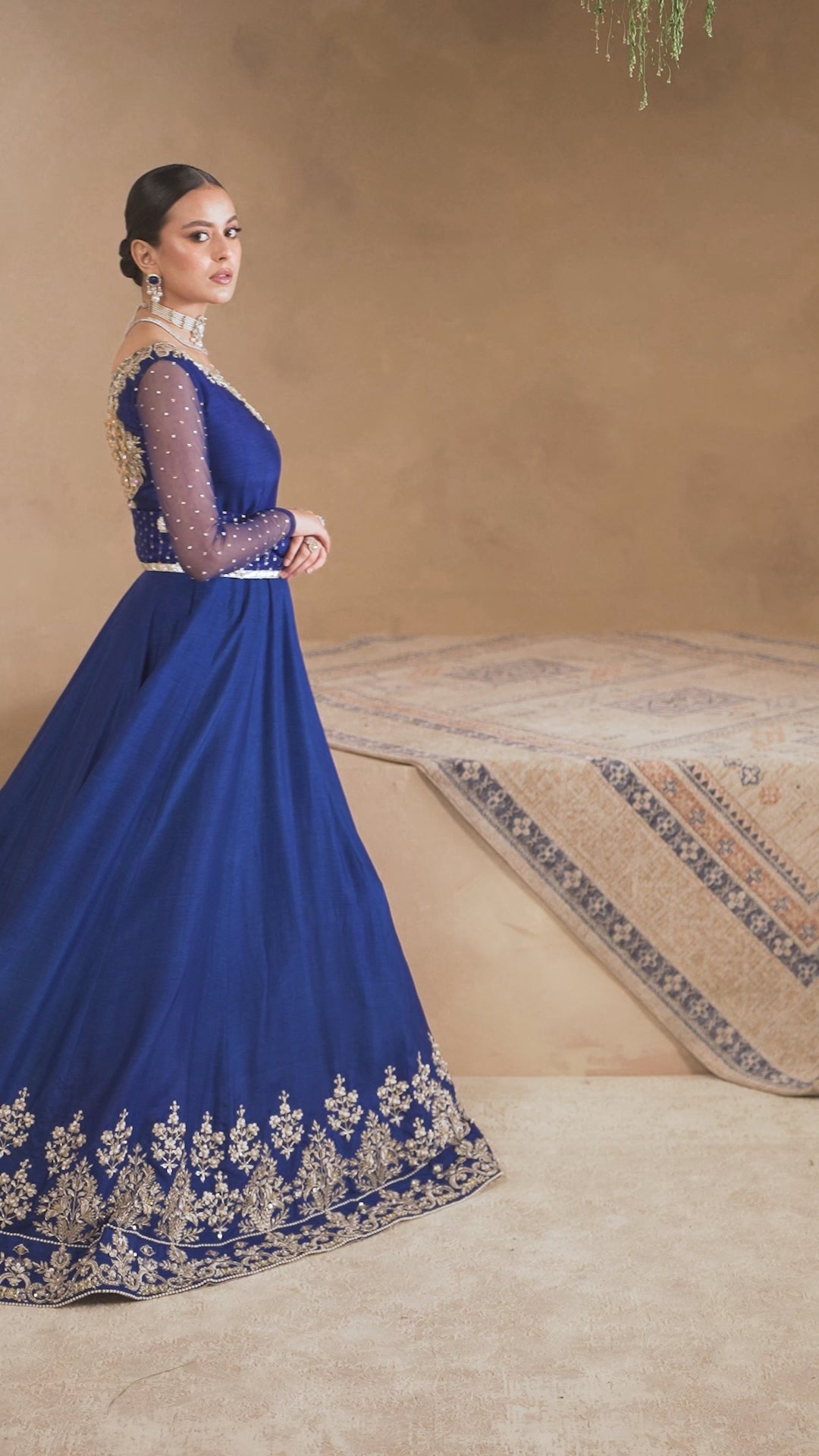A regal couture statement, this sapphire blue raw silk pishwas is adorned with heavy hand embellishment across the neckline and borders, intricately detailed with pearls and precious stones. The fitted sleeves enhance its elegant silhouette, while the look is completed with a printed dupatta, finished with embellished borders and delicate handwork throughout. Radiating grandeur with timeless sophistication, this ensemble embodies the perfect balance of tradition and couture artistry, making it ideal for vibrant wedding festivities and formal occasions.