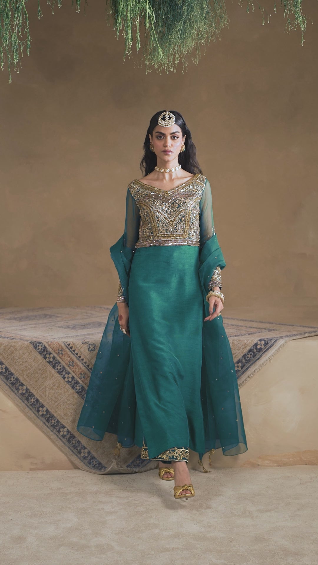 - TEAL RAW SILK LONG SHIRT WITH CHEST AND SLEEVES SWAROWSKI HAND EMBELLISHMENT.