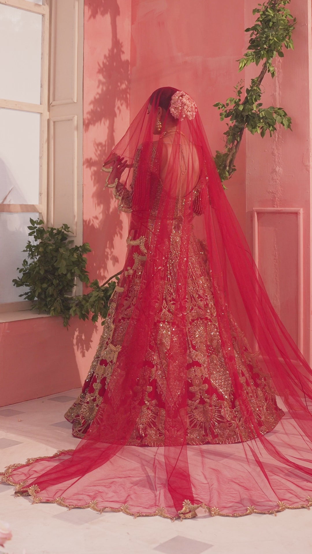 The La Rose Bridal is a regal lehenga that radiates timeless elegance and grandeur. Adorned with intricate embroidery, exquisite handwork, and gold gota richly embellished with sparkling gemstones, the ensemble embodies couture opulence. A luxurious scarlet red net dupatta and a matching heavy veil frame the look with dazzling bejeweled borders, adding depth and drama to its silhouette. Crafted as a true heirloom-worthy masterpiece, La Rose is designed for brides who wish to embody royal presence and unforgettable charm on their wedding day.