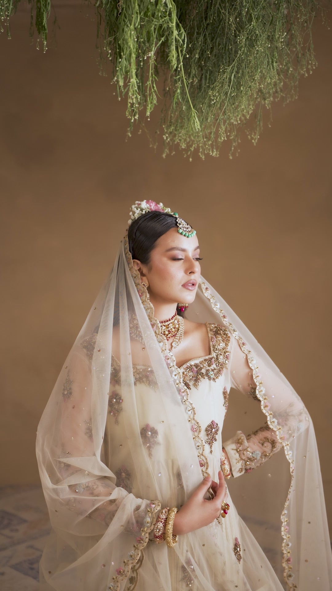 - IVORY LONG NET SHIRT WITH ALL OVER HAND EMBELLISHMENT OF RESHAM AND DAPKA.
